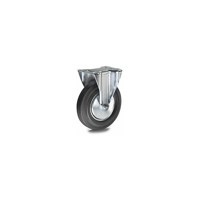 Ruota in gomma piena, Ø x larghezza ruota 125 x 38 mm, rotella a supporto fisso. Fornitura = montato. Diametro ruote = 125 mm. Forma = rotella a supporto fisso. Materiale ruote = gomma - gomma piena. Materiale cerchioni = lamiera d'acciaio, zincata a specchio. Materiale corpo = acciaio. Portata a 4 km/h = 100 kg. Tipo di fissaggio = con piastra di fissaggio. Larghezza ruote = 38 mm. Altezza d'ingombro = 155 mm. Cuscinetti ruota = cuscinetto a rulli. Resistenza alle temperature = da -5 °C fino a +60 °C. Diametro fori filettati = 9 mm. Lunghezza mozzo = 50 mm. Foro mozzo = 15 mm. Dimensioni piastra rotella a supporto fisso mm = 102x87 mm. Dimensioni piastra rotella pivottante = 105x80 mm. Interasse fori filettati = 76 - 80x60 mm. Superficie del corpo = zincatura passivata blu. Su cerchione in lamiera d'acciaio. Per impieghi medio-leggeri. Elevata silenziosità su pavimenti duri. Durezza 85 Shore A. Resistenti a temperature da -5 °C a +60 °C. Cuscinetti di pivottaggio con corona a sfere
