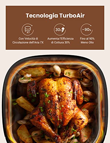 TECNOLOGIA TURBOAIR: Con il supporto della tecnologia TurboAir, 7 volte più efficace della normale tecnologia di circolazione dell'aria, Proscenic T22 riduce il 90% dei grassi contenuti negli alimenti. Nello stesso tempo, fa circolare l'aria riscaldata a 360 gradi, aumentando l'efficienza della cottura del 30%,il che permette al cibo di bloccare l'umidità interna per una finitura croccante e succosa.