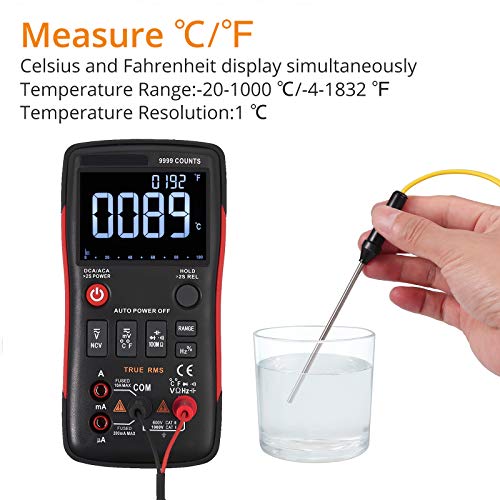 [9999 Conti Tester Tensione TRMS]: Questo 9999 Conti Multimetro a Intervallo Automatico TRMS in Grado di Misurare Temperatura, Capacità, Diodo, Continuità, NCV (Rilevamento della Tensione senza Contatto), Ohm, Hz, Duty Cycle, Tensione AC / DC, AC / DC Corrente, ecc.