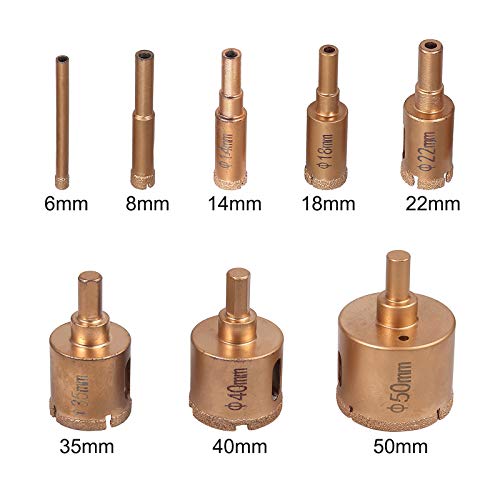 8 Punte da Trapano: Punta da Trapano Diamantata da 8 Taglie: 6mm, 10mm, 14mm, 18mm, 35mm, 40mm, 50mm. Diametro del Foro: 6-50mm, Profondità di Perforazione: 35mm, Diametro del Gambo: 6-10mm, Lunghezza Totale: 65mm.