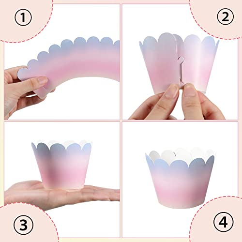 【FACILE DA USARE】 Il set di involucri per cupcake e topper per unicorno ha un design flat pack su entrambi i lati per una facile conservazione, basta inserire un'estremità della carta per cupcake unicorno nello slot e posizionare il corno di unicorno per completare l'installazione.