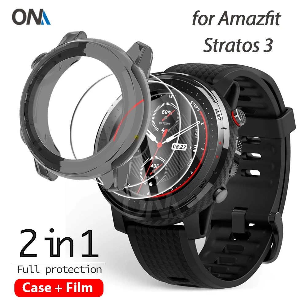 2+1 Protector Case + Screen Protector for Huami Amazfit stratos 3 smart watch Soft TPU Protective Cover Tempered Glass Film