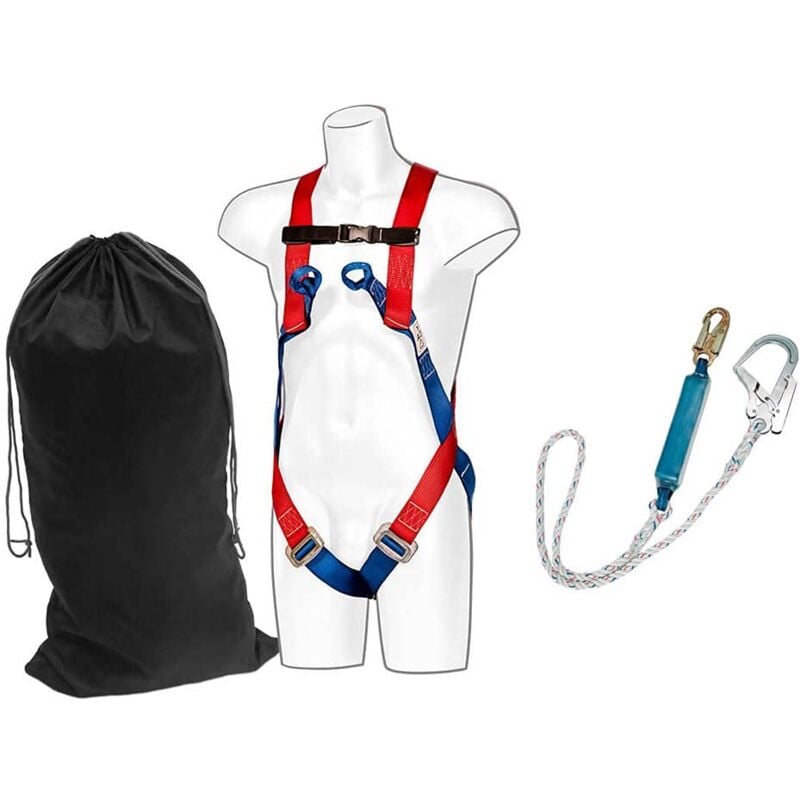 Il kit comprende una imbracatura due punti di ancoraggio, Cordino singolo con assorbitore di energia, gancio a scatto, gancio da ponteggio e una Borsa a tracolla in Nylon.