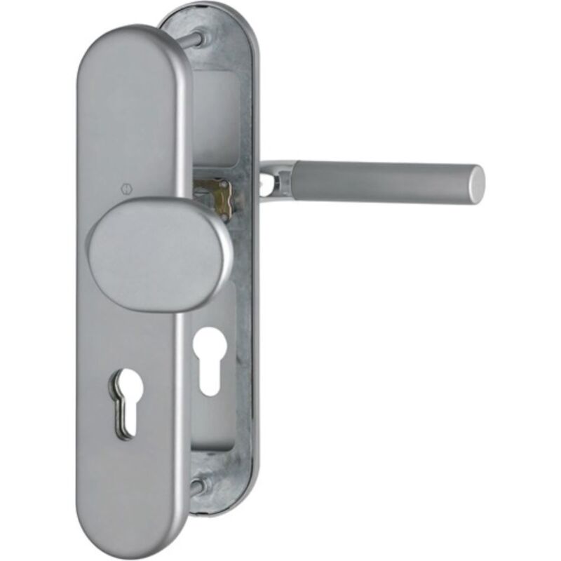 Set intercambiabile per porte di chiusura esterne /appartamento · Deposito: pulsante di manovella esterno fisso, convertibile, maniglia interna della porta sciolto · Primavera di ritorno · cuscinetti semplici senza manutenzione · Connessione: connessione a pin rapido con perno completo HOPPE-FDW (parte foro) · Coperchio cilindro: acciaio temprato, per lunghezza cilindro sporgente 10-18 mm · Sottostruttura: acciaio esterno, zamak all'interno, camma di supporto · Fissaggio: viti nascoste, continue, filettate M6 · DIN sinistra / destra · Classe di resistenza ES 1 Altre caratteristiche tecniche: · Larghezza: 54mm · Lunghezza: 250mm · Copertura: senza coperchio del cilindro · Spessore dello scudo: 12 mm · Colore No.: F49/F9-2
