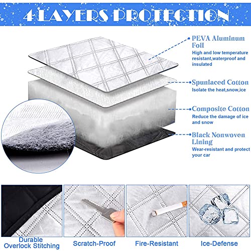 【4 STRATI DI MATERIALE SPESSO】 La nostra copertura antigelo per auto è composta da 4 strati di foglio di alluminio PEVA - blocca la neve e la luce solare riflettente del ghiaccio, cotone spunlaced - isola dal calore del sole, fodera in tessuto non tessuto nero - protegge parabrezza dell'auto, cotone composito: mantenere la temperatura nell'auto.