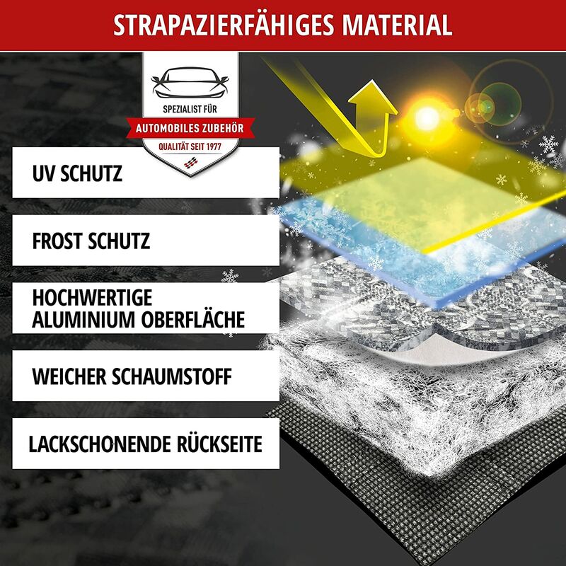 Utilizzabile tutto l'anno: lo scudo termico per parabrezza WALSER protegge in modo ottimale il parabrezza e i tergicristalli dai raggi UV in estate e da ghiaccio e neve in inverno.Qualità dei materiali di alta qualità: la copertura del parabrezza è realizzata in 4 -strato di materiale composito con uno strato di alluminio che riflette i raggi UV. Protezione extra: le coperture laterali proteggono anche gli specchietti laterali dalle intemperie. Le strisce riflettenti garantiscono una migliore visibilità.Installazione rapida: la copertura protettiva del parabrezza può essere fissata al lato della porta con una linguetta e le coperture degli specchietti laterali possono essere semplicemente tirate sopra gli specchietti. Conservazione sicura: la copertura del disco ha una pratica custodia .