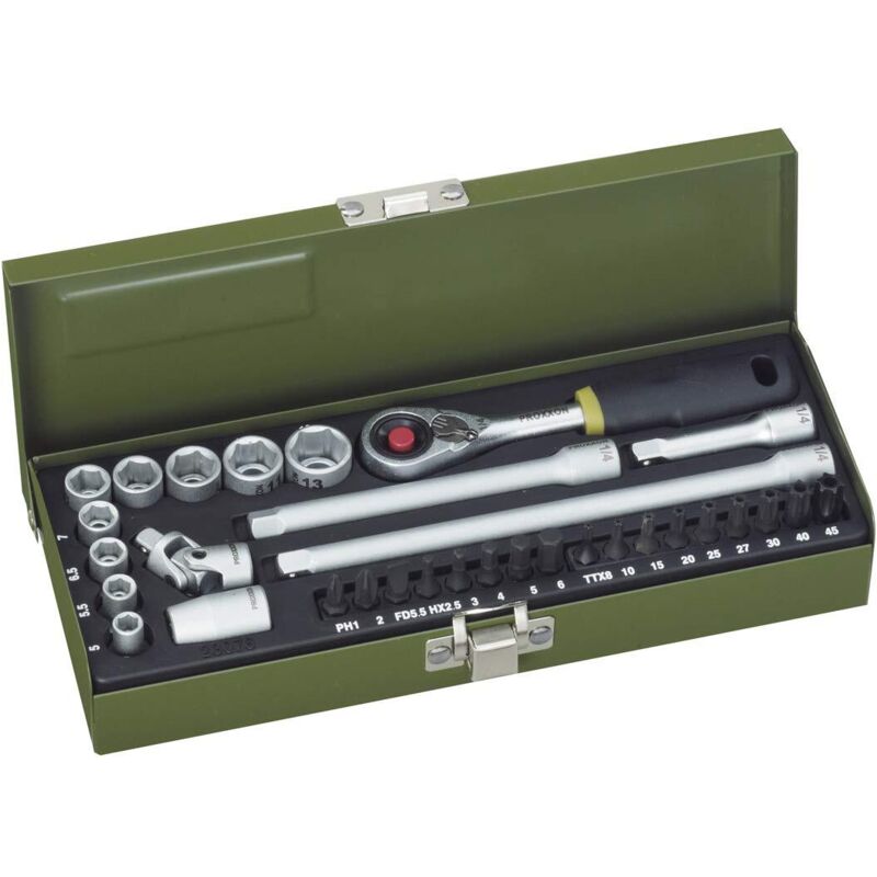 Dettagli tecnici Contenuto 1 pz. Funzione metrico Impronta (cacciavite) 1/4 (6.3 mm) Materiale Acciaio al cromo vanadio Proprietà del materiale nichelato, cromato Tipo prodotto Inserto a bussola Incluso nella consegna Cricchetto compatto da 1/4 (6,3 mm) - Inserti per chiave a brugola SW 5 - 13 mm - Prolungamento 50/100/150 mm - Bit, L=25 mm: scanalatura 5,5 mm, a croce Phillips PH 1/PH 2, esagono interno SW 2,5 - 6 mm, Torx T 8 - T 45 - Giunto universale - Adattatore - Scatola in acciaio. Requisiti di sistema null