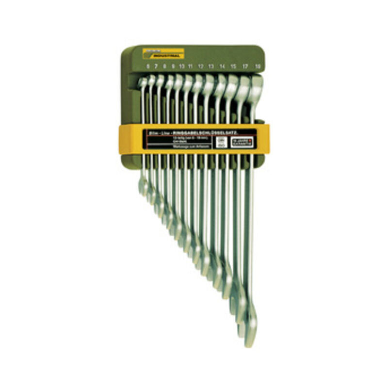 Art. 23820 in acciaio al cromo vanadio. Ottima protezione superficiale mediante doppia nichelatura e singola cromatura. Con finitura liscia e facile da impugnare. Extra piatte. Testa dellanello spostata di 15. Garanzia 10 anni. Set 12 pezzi misura 6 - 7 - 8 - 9 - 10 - 11 - 12 - 13 - 14 - 15 - 17 e 19 mm. Ogni chiave ha un posto chiaramente contrassegnato per la conservazione. Il supporto in plastica offre anche fori di fissaggio.