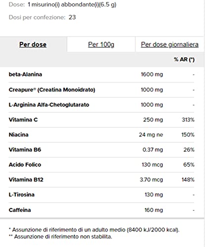 Dose Giornaliera Raccomandata: Nei giorni di allenamento, assumere 1 dose (6.5g) 30 minuti prima dell'allenamento. Istruzioni per l'uso: Per preparare 1 dose, sciogliere 6,5g (1 misurino abbondante) di polvere in 200mL d'acqua. Il misurino è all'interno della confezione.