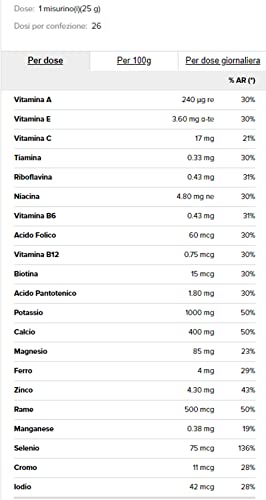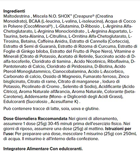 Dose Giornaliera Raccomandata Nei giorni di allenamento, assumere 1 dose (25g) 30-45 minuti prima dell'esercizio fisico. Nei giorni di riposo, assumere una dose (25g) al mattino. Istruzioni per l'uso: Per preparare una dose, mescolare 1 misurino (25g) con 250mL di acqua. Il misurino è all'interno della confezione.