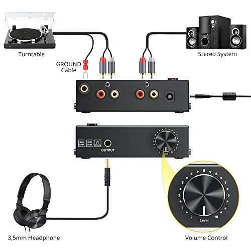 PROZOR Preamplificatore Phono Volume Regolabile Ingresso RCA e Uscita Tipo RCA e 1/4'' TRS PreAmp Audiophile M/M da 2 RCA a 2 RCA Preamplificatore Giradischi con Adattatore EU - Nero