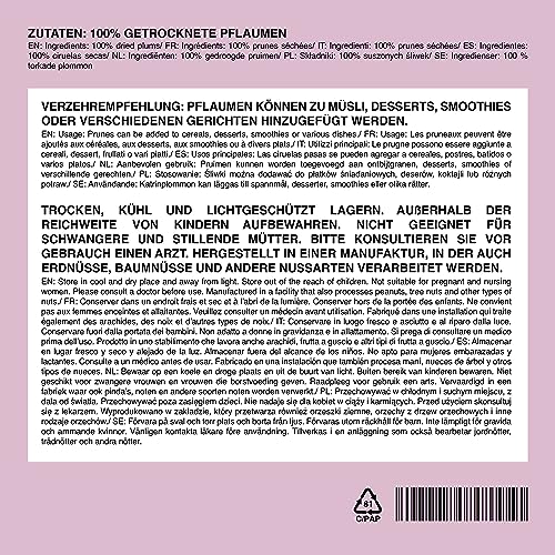 AMPIA GAMMA DI APPLICAZIONI: Le prugne secche sono deliziose per il consumo diretto. Possono essere consumati in combinazione con muesli, muesli o come aggiunta ai pasticcini. Sono un'ottima aggiunta a uno stufato di pollo con prugne o stufato di agnello con prugne e mandorle.