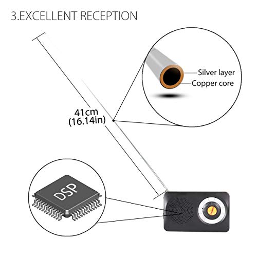2) Antenna retrattile di rame (fino ai 41 cm), rende il segnale più stabile. Che sia FM (87 - 108 MHz) o AM(MW) (530 - 1600 kHz), sarai sorpreso dalla performance notevole di questa mini radio portatile.