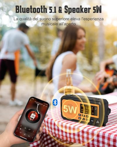 【Radio di Emergenza Multifunzionale】 La radiolina portatile J-367 (Misure: 6.5 x 2 x 3in, Peso:0.69lb) è più di una semplice radio DAB/DAB+ and FM, è anche cassa Bluetooth e una radio di emergenza, a manovella, con pannello solare. Puoi avere una torcia e luce da lettura al buio, un power bank per emergenza e un allarme SOS con flash in pericolo. Radio solare perfetto per campeggio, black out di corrente, passeggiate ed emergenze.