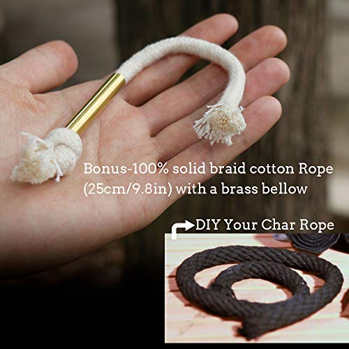 I fili di iuta cerati naturali sono dotati di soffietti in alluminio nero (8,5 cm di lunghezza) e i fili di iuta rossi e la corda di cotone sono dotati di tubi in ottone (5 cm di lunghezza, il colore giallo può essere facilmente trovato all'aperto). Tubo ottiene fiamma dove ne hai bisogno e lontano dalle dita (mai più bruciare le dita). Ciò significa che funge anche da regolatore di fiamma, aiuta a fiocchiare la fiamma e a evitare che la fiamma consumi troppo del cavo.