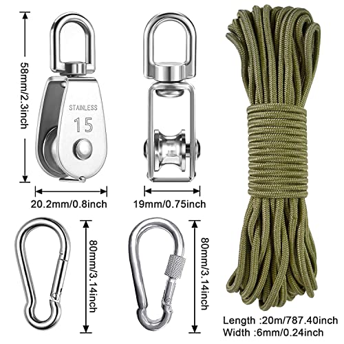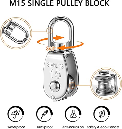 Qualità: puleggia realizzata in acciaio inossidabile 304, forte e durevole. Rulli scorrevoli e fibbie a molla sono antiruggine e durevoli. Progettato per appendere oggetti pesanti per ridurre il carico.