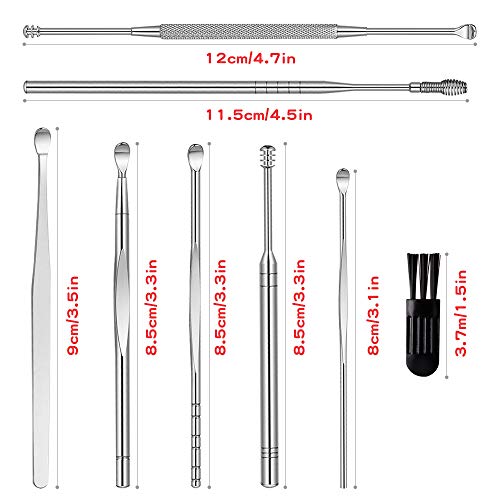 【Stile inossidabile ergonomicamente affilato】7 detergenti per curette auricolari di diverse dimensioni per pulire il cerume sia morbido che duro in modo efficiente e confortevole per evitare graffi alle orecchie delicate, non danneggiare il condotto uditivo durante la pulizia efficace. Elevata sicurezza per adulti o bambini.Una piccola spazzola inclusa per pulire gli auricolari dopo l'uso.