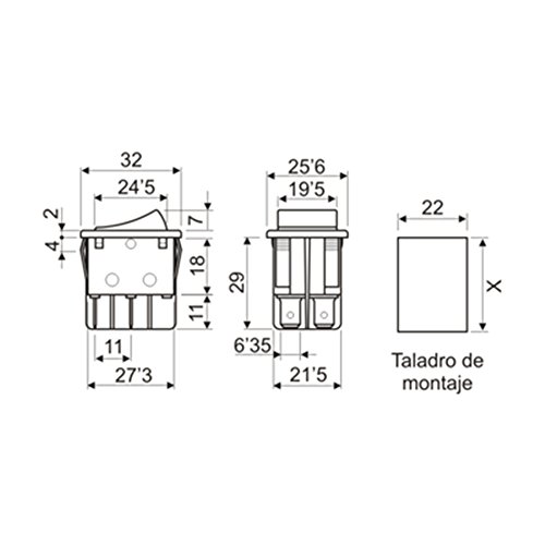 Pulsante basculante bipolare 32 x 25,6 mm ON-OFF-ON