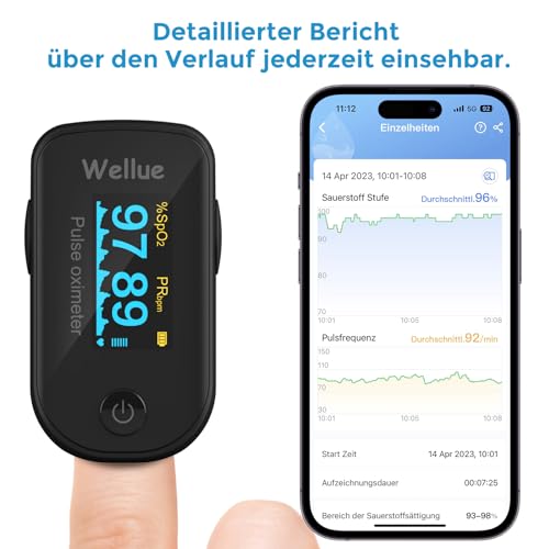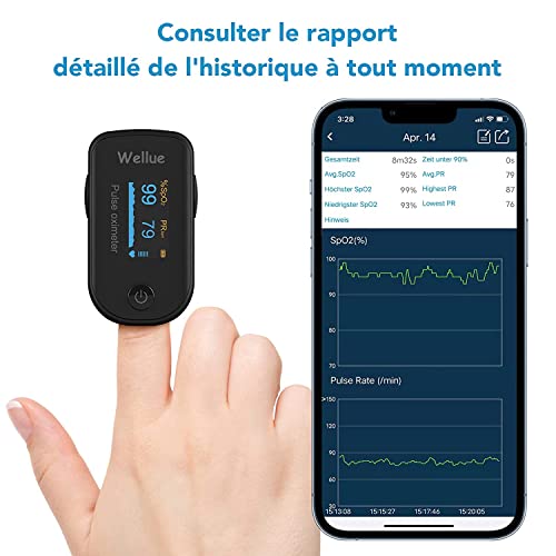 Pulsossimetro Bluetooth, Ossimetri Monitor della Saturazione di Ossigeno, Monitor della Saturazione di Ossigeno per Dito, per Livello Sp02 e Frequenza Cardiaca, Portatile con APP, Nero