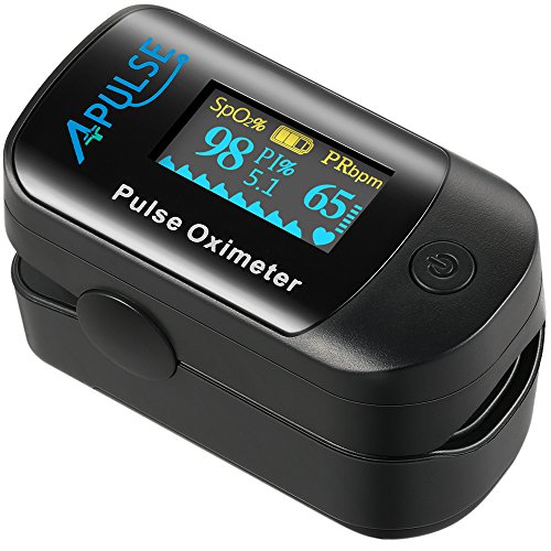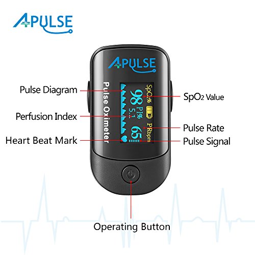 Pulsossimetro Professionale, APULSE Saturimetro Dito Portatile monitoraggio con ottica adattiva ad infrarossi e display OLED per Frequenza Del Polso (PR) e Saturazione di Ossigeno (SpO2), Indice di perfusione, con Custodia e Cordino, Batterie AAA Incluse (Nero)