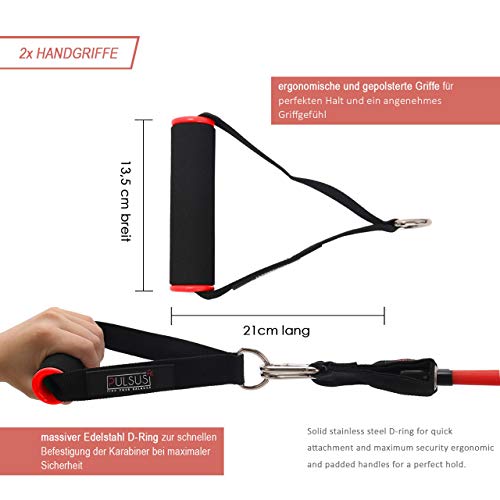 ORIGINAL PULSUSfit PREMIUM SET FASCE DI RESISTENZA - Composto da 5 fasce elastiche con diverse resistenze, 2 impugnature imbottite e antiscivolo, 2 cinghie imbottite per i piedi, 1 ancoraggio professionale per la porta e borsa per il trasporto - alta qualità di lavorazione secondo lo standard PULSUS fit, il set è particolarmente resistente e permette l'allenamento di tutti i gruppi muscolari.