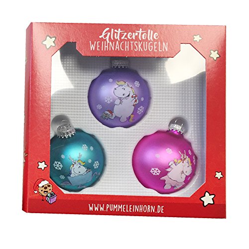 Pummeleinhorn, palline di Natale con unicorno disegnato (set da 3 pezzi)