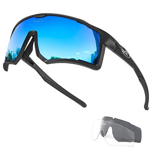 3 LENTI INTERCAMBIABILI—— PUNLUXU occhiali ciclismo dotato di 3 lenti intercambiabili con protezione UV, ma solo la lente nera è polarizzata, adatte per il sole e possono eliminare l'abbagliamento riflesso dagli occhi rilassanti. Lenti HD Clear adatte per nuvoloso In ambienti con poca luce, la visione è chiara.