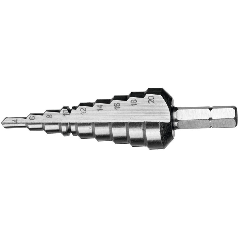 Codolo esagonale da 1/4 pollice a norma DIN 3126 C 6,3. 9 gradini di foratura con incrementi di 2 mm, utilizzabile in materiali fino a 4 mm di spessore. Con smussatura bordi (sbavatore per lamiere) nel ⌀ 10 per lamiere di 1 mm. Vantaggi: Cambio rapido e semplice tra punta e svasatore bit e bit per giraviti. Uso: Ideale per lavori di riparazione e montaggio in utilizzo mobile. Dati tecnici Materiale da taglio HSS Tipo di prodotto Punta a gradino bit Lunghezza complessiva, mm 67 Passo, mm 2 Codolo esagonale per bit C 6,3 Lunghezza codolo, mm 20 Denominazione originale prodotto 843 Campo gradini di foratura, mm 4 - 20 Altezza gradino, mm 4 Numero di gradini di foratura 9 Spessore lamiera max., mm 4