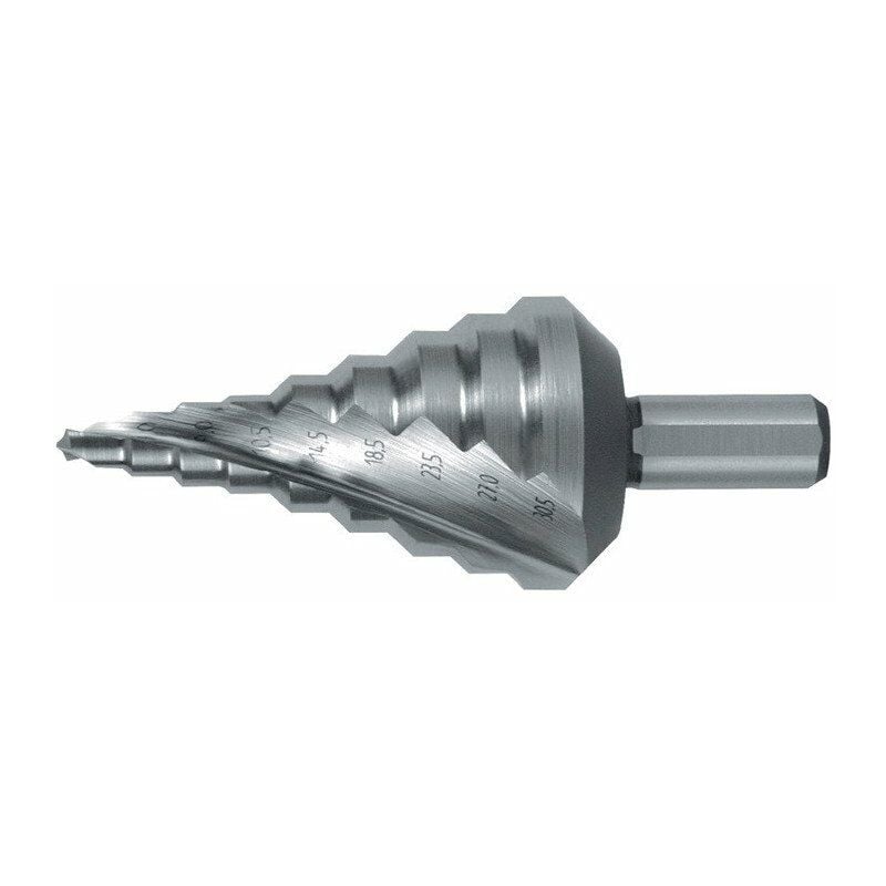 HSS · spiralgenutet · con taglio incrociato · 2 taglio · per ghiandole metriche dei cavi · Angolo di picco 118 ° · Angolo passo 90° · Albero con 3 superfici di bloccaggio Altre caratteristiche tecniche: · Angolo di picco: 118° · Angolo passo: 90° · Scanalatura: scanalata a spirale · Esecuzione: Foro del nucleo · Ø: 5,3/ 7/ 9/ 10,5/ 14,5/ 18,5/ 23,5/ 27/ 30,5 mm · Numero di talee: 2 · Materiale da taglio: HSS