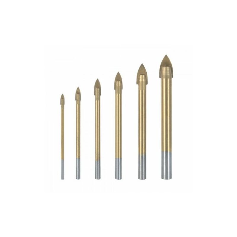 PUNTA PER CERAMICA VETRO SET 6 PZ 3 - 4 - 5 - 6 - 8 - 10 Set di sei punte con alette rivestite in titanio. Ideale per forare specchio,vetro non temperato,ceramica,porcellana ecc. Impedisce lo slittamento e di danneggiare le superfici lavorate. Punte in carburo di tungsteno e codolo cilindrico in acciaio al carbonio. Set da 6 punte di misura: mm 3 - 4 - 5 - 6 - 8 - 10.