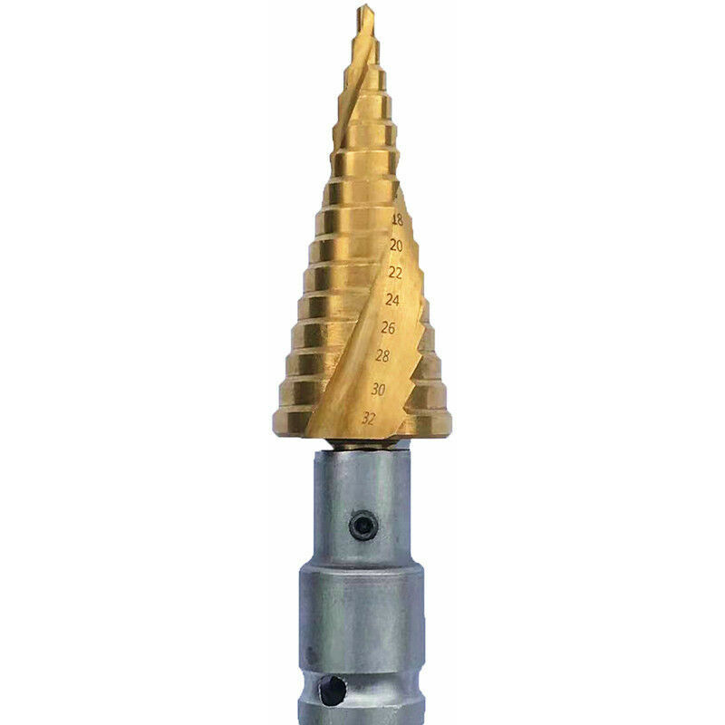 Adatto per fresatura laterale, spianatura e finitura di ghisa e titanio. Punte elicoidali a gradino, 4 -20/4- 32 mm 2 misure, il materiale principale è acciaio ad alta velocità, punte a gradino di alta qualità placcate in titanio. Classico acciaio rapido con rivestimento in titanio per una comprovata capacità e durata nella perforazione di fori su plastica, alluminio, rame, acciaio inossidabile e molti altri tipi di lamiera. < li> Le punte da trapano a gradino, chiamate anche punte da trapano a gradino o punte da trapano a pagoda, sono utilizzate principalmente per la lavorazione di punte da trapano per legno e acciaio. La lavorazione di fori di diverso diametro secondo necessità può realizzare l'elaborazione una tantum di fori di grandi dimensioni senza cambiare la punta del trapano e posizionare i fori. Buon design - Il triangolare il gambo si inserisce saldamente nel mandrino dell'utensile elettrico ed elimina lo slittamento;