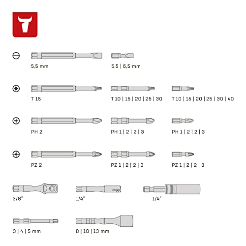 VERSATILE: il set è dotato di tutte le punte, gli adattatori e le bussole più comuni. È perfettamente adatto per l'uso su superfici di viti morbide e dure nelle automobili, nell'ingegneria meccanica, nel fai-da-te e nell'assemblaggio, grazie alle parti conformi agli standard, ad esempio con i comuni avvitatori a batteria.