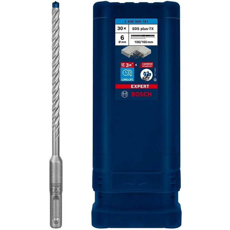 Set di punte BOSCH EXPERT SDS-Plus - Dura fino a 3 volte più a lungo della punta Bosch SDS plus - Lunga durata per la foratura del calcestruzzo armato - Bosch Carbide Technology assicura punte eccezionalmente durevoli - Forare il calcestruzzo armato con una testa integralmente in metallo duro a 4 taglienti - Adatto a tutti i martelli perforatori SDS plus