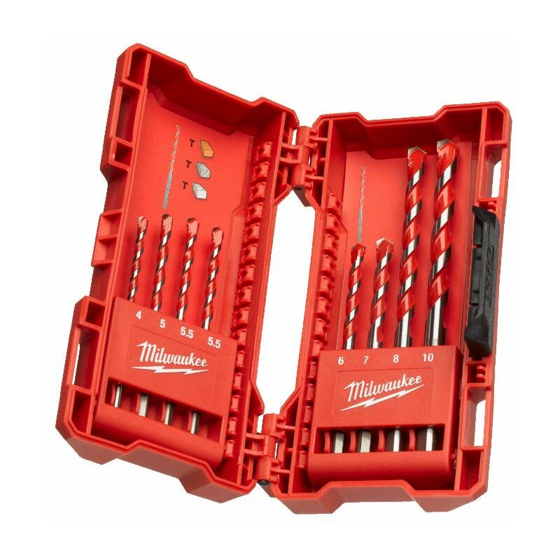 Dettagli: Utensili Milwaukee + Accessori Milwaukee: la combinazione perfetta per risultati professionali! Le punte TCT sono adatte alla foratura di calcestruzzo, calcestruzzo cellulare, muratura e granito. A partire da un diametro di 5 mm, le punte per trapani a percussione sono fornite con un gambo piatto a 3 punte per evitare che la punta scivoli nel mandrino. Per i diametri 3 e 4 mm, la punta ha un gambo rotondo. La scanalatura rossa consente di identificare facilmente la punta. Può essere utilizzata su uno scalpello in modalità di foratura. Caratteristiche: Composizione: Ø 4 x 90 mm, 2 x Ø 5,5 x 100 mm, Ø 6 / 7 x 120 mm, Ø 8 / 10 x 150 mm