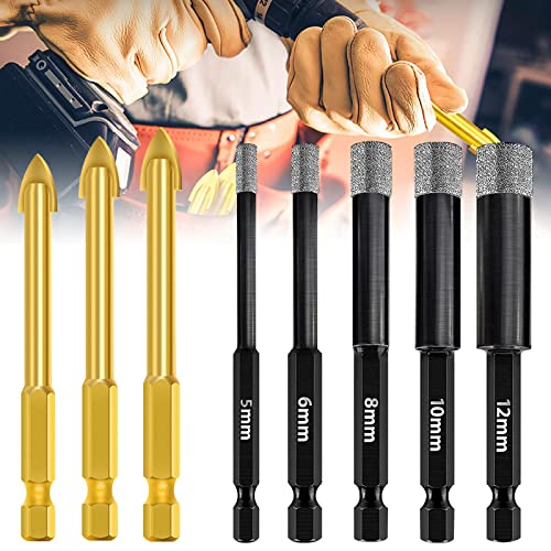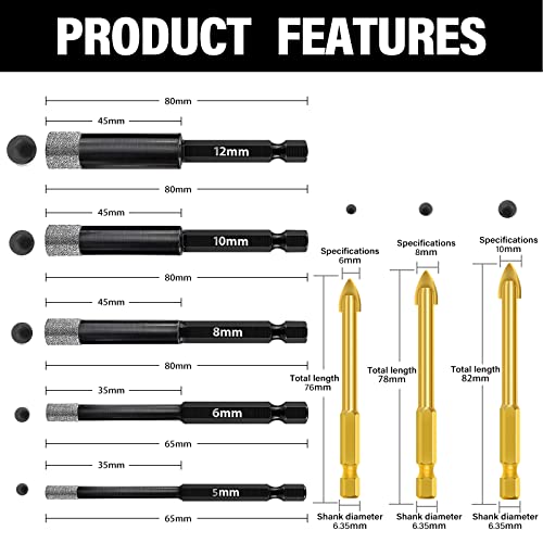 【Set Punte Trapano Metallo Vetro】 Il pacchetto include una punte diamantate gres Nero porcellanato da 5 pezzi:5 mm,6 mm,8 mm,10 mm,12 mm e 3 punte diamantate con gambo esagonale:6 mm,8 mm,10 mm,8 diverse dimensioni di punte diamantate,così puoi risparmiati la noiosa perforazione con una punta diamantata gres porcellanato,che ti consente di praticare fori in modo più preciso e semplice.