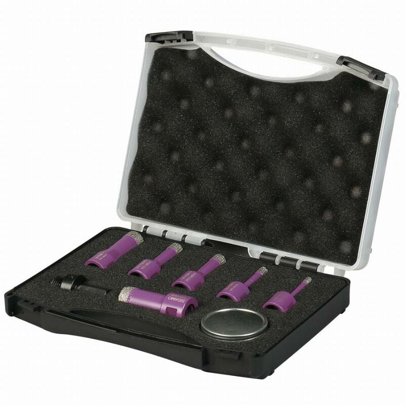Dettagli: Punta diamantata a testa scanalata Foratura a secco, orizzontale o verticale Testa completamente diamantata con tecnologia di brasatura a vuoto Con foro M14 per il montaggio su smerigliatrice Adattatore esagonale opzionale per foratrice codice 11101447 Ottima velocità di foratura e finitura eccellente in materiali decorativi come ceramica, gres, terracotta, materiali compositi, vetroresina, marmo, granito Fori di estrazione del nucleo Caratteristiche: Formato: Scatola Per macchina: Smerigliatrice Diametro (mm): 6 - 8 - 10 - 12 - 18 - 22 Modello di connessione: M14 Lunghezza utile (mm): 35 Velocità massima (giri/min): 12 200 Altezza del segmento (mm): 10 Spessore del segmento (mm): 2,5