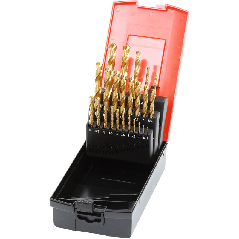 Composto da punte elicoidali a norma DIN 338. Nocciolo senza conicità. Affilatura di precisione dei taglienti. Profilo rettificato: concentricità radiale elevata e affilatura precisa dei taglienti, punte per la produzione in serie. Con punta di forma C a partire dalla Dim. 2,4 mm. Dati tecnici Olio idoneo CuZn m/min limitatamente adatto Acciaio < 1400 N/mm² m/min limitatamente adatto INOX < 900 N/mm² m/min limitatamente adatto Acciaio < 500 N/mm² m/min idoneo Alluminio (a truciolo corto) m/min limitatamente adatto a umido max. idoneo INOX > 900 N/mm² m/min limitatamente adatto GG(G) m/min idoneo Alluminio > 10% Si m/min limitatamente adatto Acciaio < 750 N/mm² m/min idoneo Ti > 850 N/mm² m/min limitatamente adatto Acciaio < 1100 N/mm² m/min limitatamente adatto Acciaio < 900 N/mm² m/min idoneo Materiale da taglio HSS Modello N Norma DIN 338 Tolleranza ⌀ nominale h8 Rivestimento TiN Angolo di affilatura Grad 118 In cassetta sì Colore collarino senza Passaggio interno per LR no Tipo di