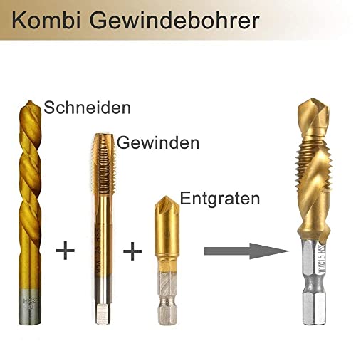 Set di 6 punte per filettatura combinate HSS Fixinus 1/4", attacco esagonale per svasatura, set di punte per trapano a macchina, in acciaio inox M3, M4, M5, M6, M8, M10