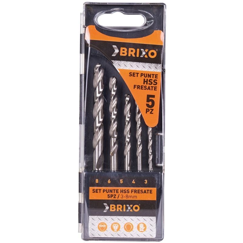 Set 5 punte per forare HSS in acciaio fresato per trapano tassellatore Brixo Set punte 5 pezzi con le seguenti dimensioni Diametro 3-4-5-6-8 mm. In acciaio super rapido fresato, per ferro, acciai legati, acciaio fuso. DIN 338