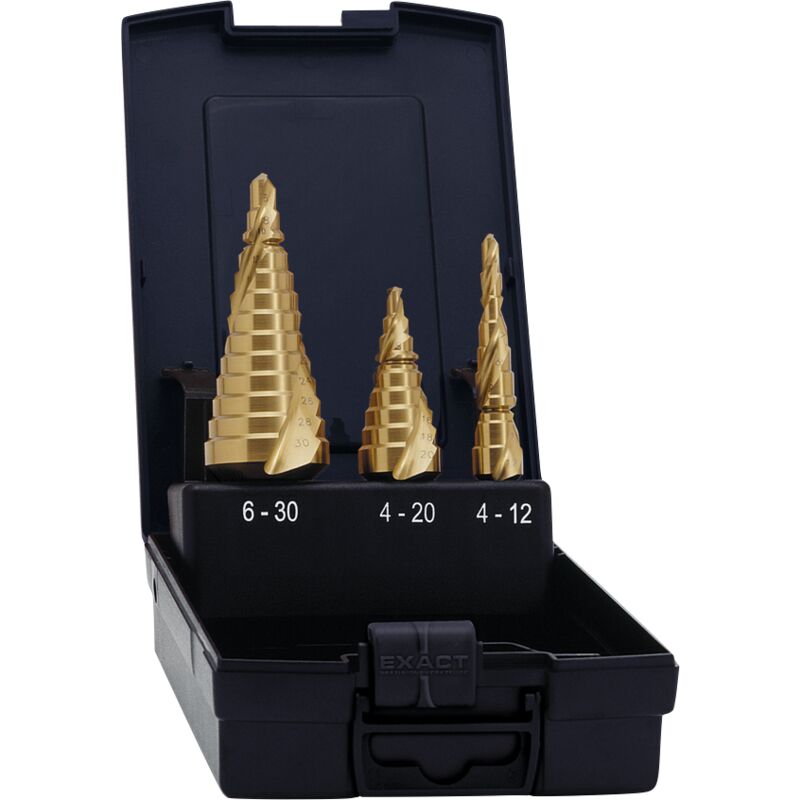 Dotazione: - 3x Punte per foratura a gradini ( 4 - 12 / 4 - 20 / 6 - 30 mm ) - 1x Cassetta di plastica Descrizione prodotto: Con il set di punte a gradino in 3 pezzi di EXACT, forare con precisione millimetrica non è affatto un problema. Con le punte a gradino, disponibili in tre diverse misure (4 - 12;