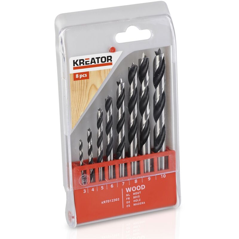 Punte per legno Kreator in una confezione da 8 punte. Set di 8 punte: diametri 3, 4, 5, 6, 7, 8, 9 e 10 mm