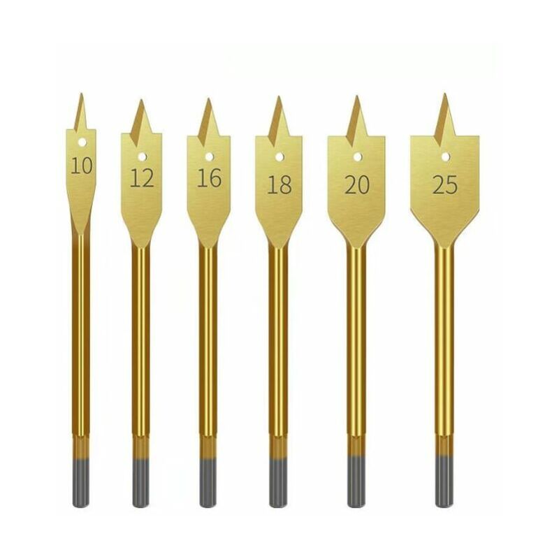 Realizzato in acciaio ad alto tenore di carbonio, titanio. La punta centrale e i taglienti molto affilati impediscono al legno di spaccarsi. Dimensioni: 10, 12, 16, 18, 20 e 25 mm. Funziona su legno tenero, legno medio duro, truciolare, cartongesso, plastica e fibra di vetro. Gambo esagonale per un facile cambio della punta. Progettato per trapani, cacciaviti e alberi a gomiti.