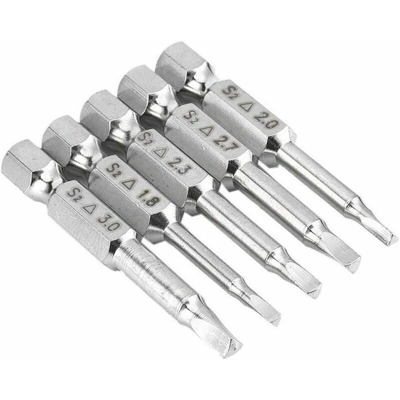 lunghezza totale: 50 mm. Testa triangolare magnetica, antiruggine, antiscivolo, assorbe facilmente le viti. È adatta per l'installazione su avvitatori pneumatici, avvitatori elettrici, trapani ricaricabili e giacche antivento. Ampiamente utilizzato in utensili elettrici, gruppi di cacciaviti elettrici, industria elettronica, industria di strumenti di precisione, elettrodomestici. Dimensioni del prodotto: la lunghezza è 5 cm, il diametro della testa di taglio è 1,8 cm, 2 cm, 2,3 cm, 2,7 cm e 3 cm e il diametro dell'impugnatura esagonale è 6,35 mm (o 1/4 di pollice). Quantità di spedizione: 1 set, inclusi 5 punte per cacciavite