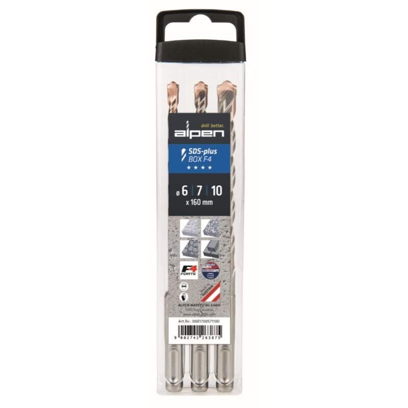 La punta SDS-plus F4 con profilo de 4 fasi brevettato de e piastra duro metallo brevettata, Bassa usura, moltolunga durata..., Punta a martello ad alte prestazioni per la foratura a martello di calcestruzzo, pietra naturale e muratura, Diametro: 5, 6, 8 mm, Lunghezza: 160 mm.