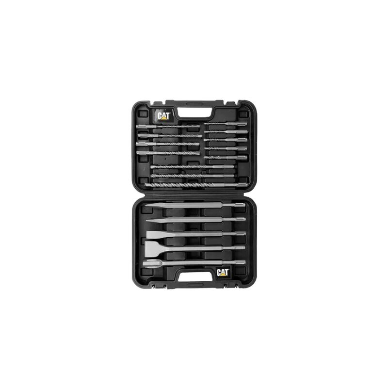 Il set di punte e scalpelli della CAT,fornisce tutti gli scalpelli con attacco SDS Plus. Adatto per la foratura rapida di fori per tasselli, ancoraggi o fori liberi in muratura, pietra, calcestruzzo e laterizi/blocchi Spirale a 2 canali appositamente sviluppata per un'efficace rimozione della polvere Design ottimizzato della testa di foratura con punta in metallo duro con 2 taglienti. 1 Sds plus 5 mm x 110 mm 1 Sds plus 5,5 mm x 110 mm 1 Sds plus stoppino 6 mm x 110 mm 1 Sds plus stoppino 8 mm x 110 mm 1 Sds plus stoppino 10 mm x 110 mm 1 Sds plus stoppino 6 mm x 160 mm 1 Sds plus stoppino 7 mm x 160 mm 1 Sds plus stoppino 8 mm x 160 mm 1 Sds plus stoppino 10 mm x 160 mm 1 Sds plus stoppino 8 mm x 210 mm 1 Sds plus stoppino 10 mm x 210 mm 1 Sds plus stoppino 14 mm x 210 mm 2 scalpelli Sds plus 250 mm. 2 scalpelli a bussola Sds plus 20 x 250 mm e 40 x 250 mm. 1 scalpello per sgorbia Sds plus. Il set è adatto per tutti i trapani di tutti i brand come Cat, Milwaukee, DeWalt e Bosch. La