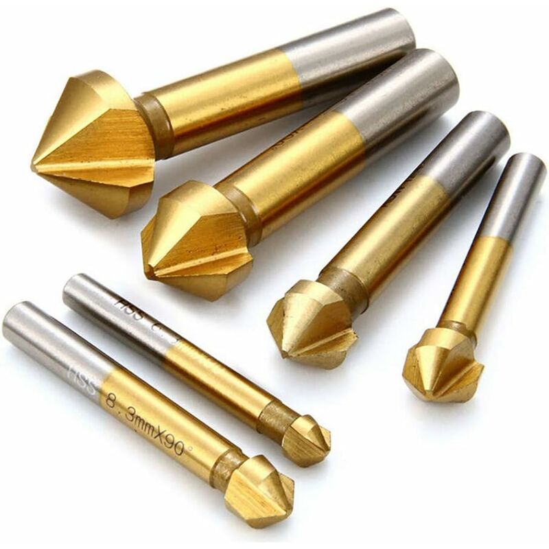 Materiale della punta: acciaio ad alta velocità. Adatto per alluminio, ottone, bronzo, ferro, plastica, acciaio inossidabile, lamiera, legno, acciaio al carbonio, pannelli isolanti, pannelli in PVC, ecc. Descrizione del prodotto I pacchetti includono: 6 x 3 punte per trapano svasatore. Modello: smusso a tre lame in oro da 6 pezzi