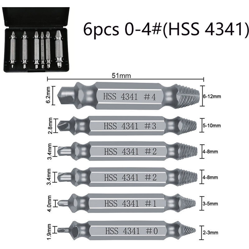 Caratteristiche: Un kit di estrazione da 6 cps che soddisfa le esigenze di diverse dimensioni di viti e bulloni. Facile da rimuovere ruggine, viti rotte, senza problemi. Costruito in acciaio ad alta velocità 4341 premium, resistente alla ruggine e abbastanza resistente per un uso prolungato. Uno strumento perfetto per chi lavora con le viti. Specifica: Materiale: acciaio 4341#HSS Dimensioni scatola: 8*6*1,8 cm Misura dello strumento di rimozione delle viti: 0#+1#+2#x2+3#+4# 0# rimuovi diametro 2~3mm 1# rimuovere il diametro 3~5mm 2# rimuovi il diametro 4~8mm 3# rimuovi il diametro 5~10mm 4# rimuovi il diametro 6~12mm Il pacchetto include: 1 set di rimozione viti danneggiate 1 scatola