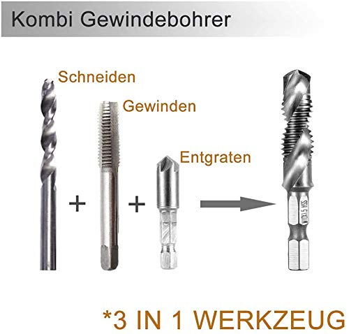 Materiale: acciaio ad alta velocità. Set di maschi filettati a destra con livello di foratura e attacco esagonale da 1/4", HSS per M3, M4, M5, M6, M8, M10 per elevate esigenze di sicurezza e durata.