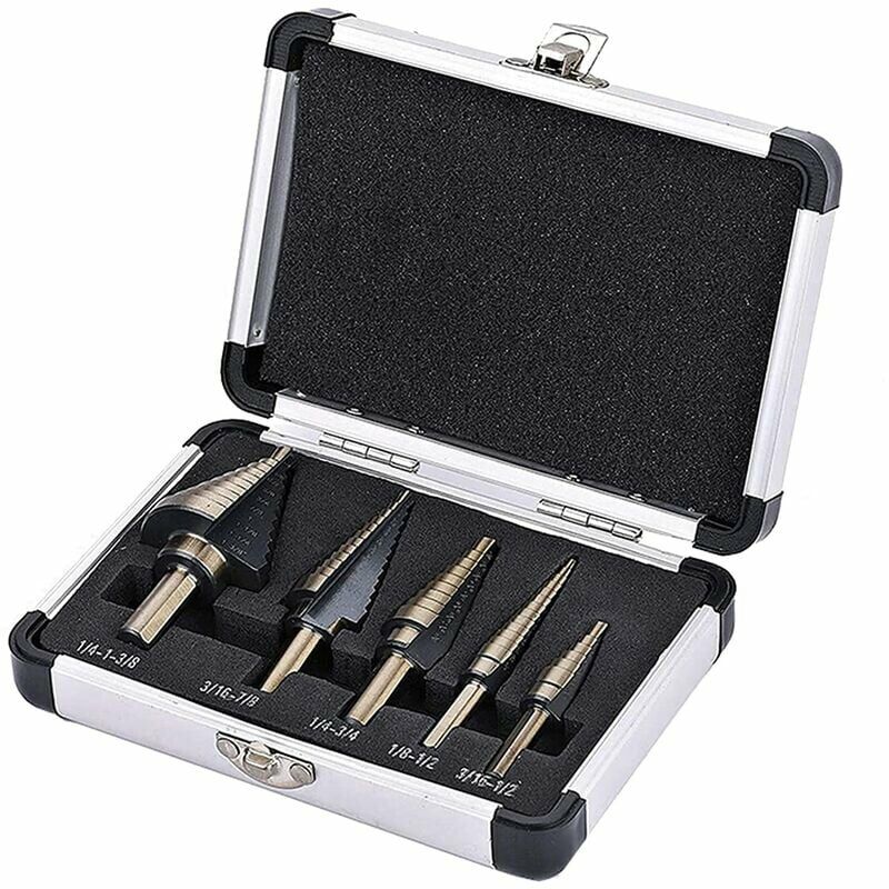 50 misure in 5 pezzi: 50 misure di punta a gradino - Ogni punta a gradino può forare più diametri del foro. Può funzionare come 50 punte elicoidali Acciaio ad alta velocità e rivestimento in titanio: realizzato in acciaio HSS di alta qualità, con rivestimento in titanio per ridurre l'attrito e il calore. Design: due- il design della scanalatura offre un taglio più rapido e uniforme, il design del gambo a 3 lati impedisce lo slittamento nel mandrino del trapano Usi estesi: le punte per trapano a gradino possono essere utilizzate per smussare, svasare, forare o allargare i fori. Le punte per trapano a gradini possono lavorare con lamiere in acciaio inossidabile, lega di alluminio, plastica e legno. Cosa ottieni: 5 punte per trapano a gradini con custodia in alluminio - Regalo ideale per la festa del papà, perfetto per gli appassionati di fai da te< /p> Dimensioni: scatola di alluminio circa 10,5 x 15 x 4,2 cm. Quantità: un set di 5 pezzi Colore: alluminio bronzo
