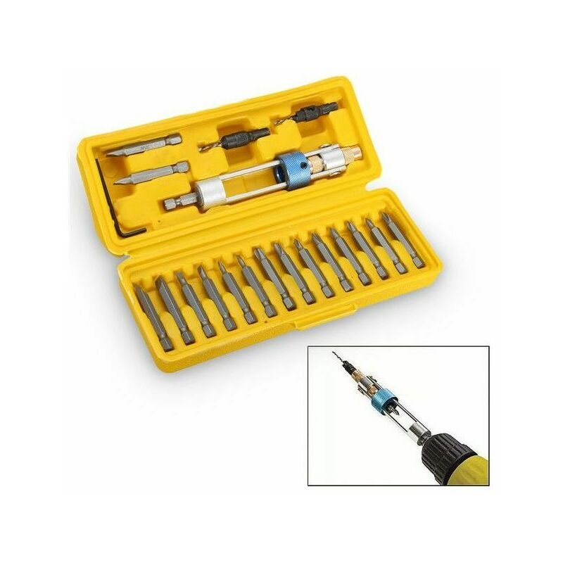 Set di 20 punte per trapano per trapano per carpenteria Il pacchetto include: 1 X trapano avvitatore 8 X punte Phillips (2 x PH0 / PH1 / PH2 / PH3) 8 X punte con testa (2 x 1/8 ( 3,2 mm, 5/32"4 mm, 3/16"4,8 mm, 1/4"6,3 mm) 2 Xbit (3/32 "2,4 mm, 1/8" 3,2 mm) 1 chiave esagonale Caratteristiche del prodotto: Cambia facilmente tra bit in pochi secondi! - La testa girevole ruota e si blocca dalla perforazione alla guida Funziona con la tua punta da trapano Trapano per guidare in metà tempo